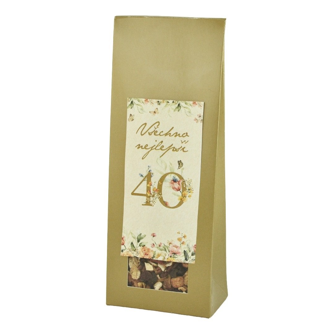 Luxusní zlatá dárková krabička s motivem velké zlaté „čtyřicítky“ obklopené jemnými květinami a motýlky, které dodávají celkovému designu elegantní a svěží vzhled.